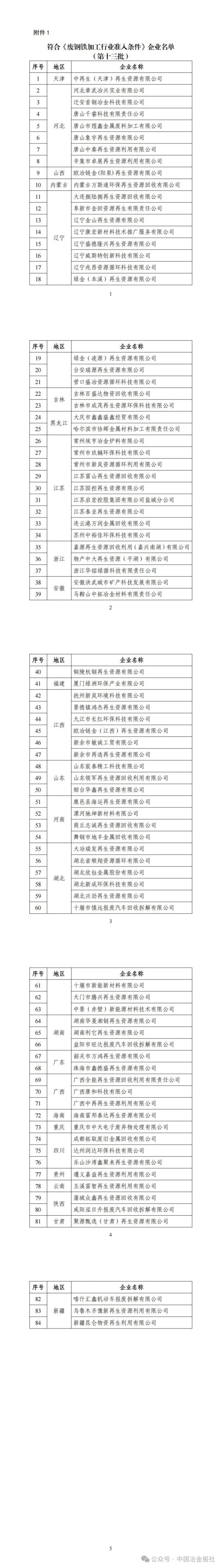 公告内容显示,符合《废钢铁加工行业准入条件》的企业名单(第十三批)共包括84家企业。具体名单如下: