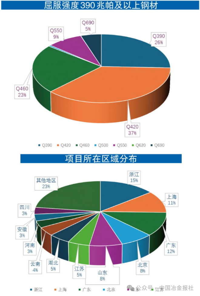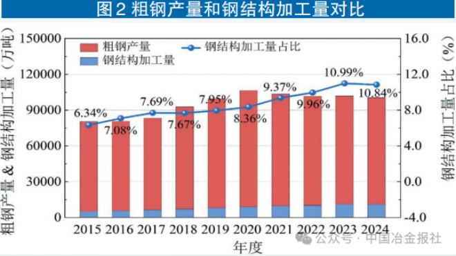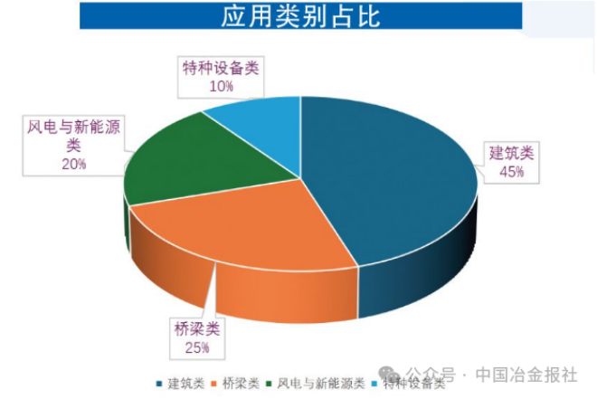 根据中国钢结构协会调研数据,2020年底,工业及民用建筑、桥梁、塔桅、非标等领域屈服强度390兆帕及以上钢材加工量占全部钢材品种约9%。截至2024年底,上述领域屈服强度390兆帕及以上钢材应用占比达14%,提升5个百分点。除数量增长外,高强钢应用领域也得到进一步拓宽,在抽水蓄能电站、新一代核电站建设、新能源开发等领域取得突破性进展。