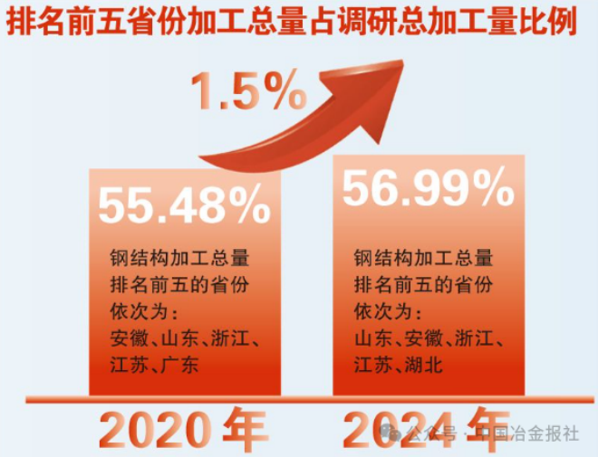 10年来,我国钢结构加工量从5100万吨增长到10900万吨,增长率达113.73%,实现翻番以上增长。仅“十四五”期间(截至2024年底,下同),钢结构加工量从8900万吨增长到10900万吨,增长率达22.47%,呈稳健、强劲的增长态势。