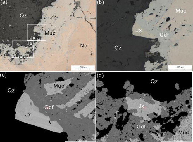 金秀矿(Jx)的反射光及背散射电子图像;Nc-红砷镍矿;Muc-砷镍矿;Gdf-辉砷镍矿;Qz-石英