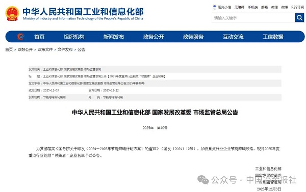 12月22日,工业和信息化部、国家发展改革委、市场监管总局三部门印发了公告,公布了2025年度重点行业能效“领跑者”企业名单(以下简称为“名单”)。