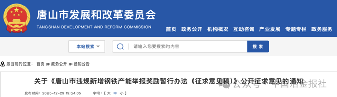 近日,唐山市发改委发布《唐山市违规新增钢铁产能举报奖励暂行办法(征求意见稿)》,公开征求意见。