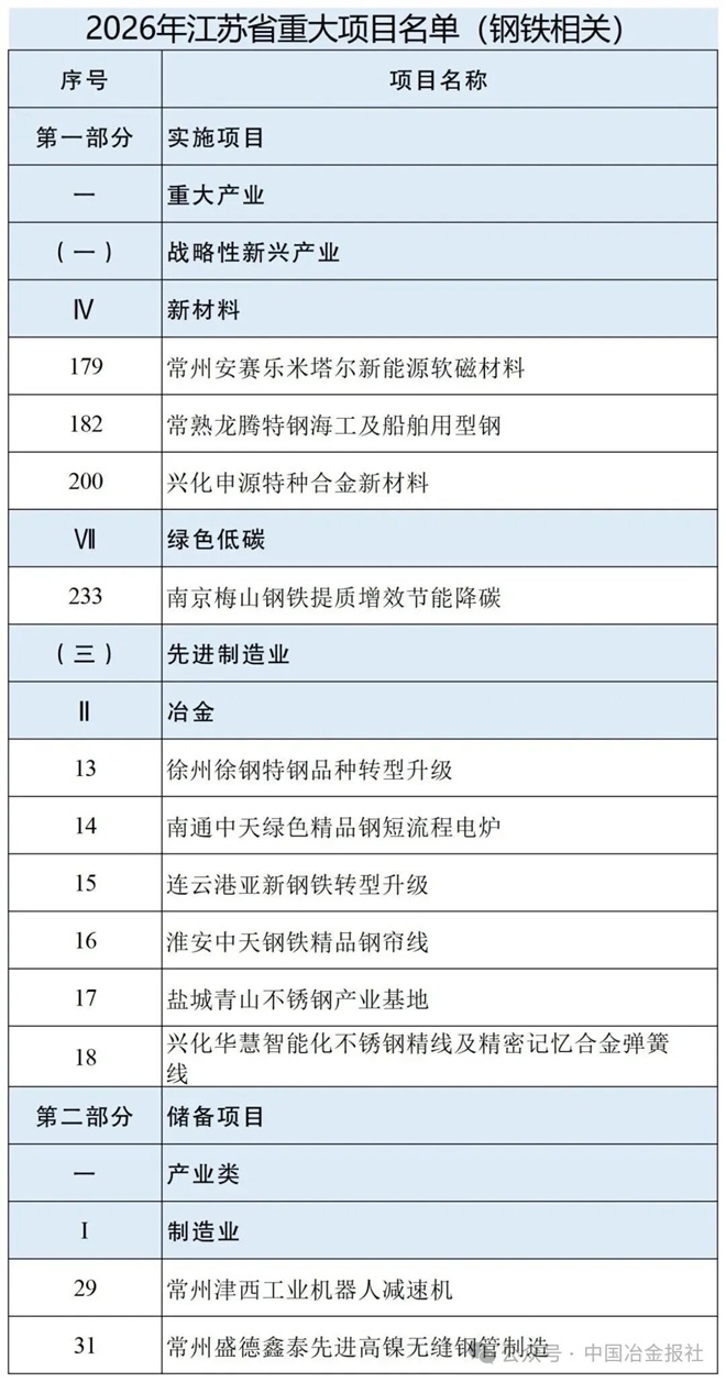 近日,江苏省发展改革委发布2026年江苏省重大项目名单、2026年江苏省民间投资重点产业项目名单。其中,钢铁项目整理如下: