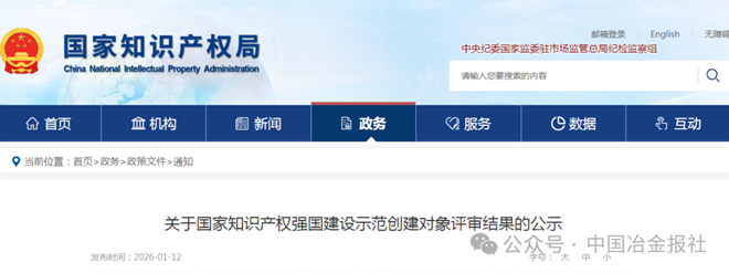 1月12日,国家知识产权局官网公布了关于国家知识产权强国建设示范创建对象评审结果。