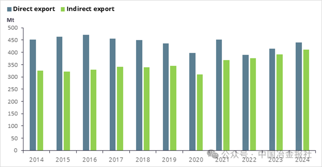 2014年至2024年期间,74个国家的钢铁间接出口量从2014年的3.25亿吨增至2024年的4.10亿吨,增幅为26%。2024年,钢铁间接贸易量相当于直接出口量的93%。