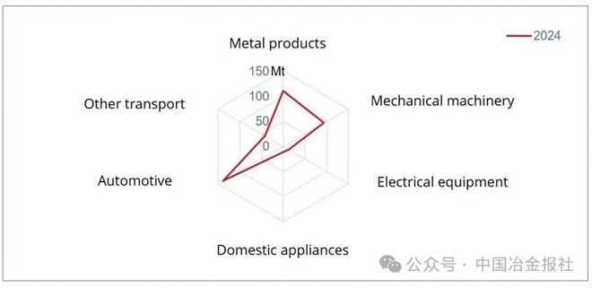 按行业划分的钢铁间接出口量(单位:百万吨(Mt),折合成成品钢量)