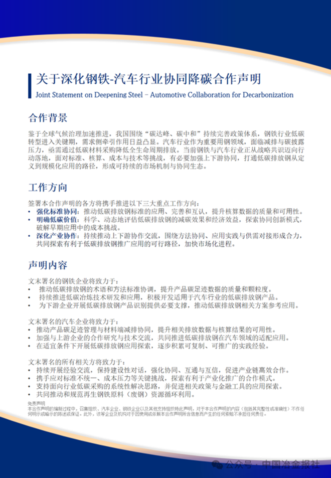 发布《合作声明》的目的,是推动钢铁企业、汽车企业及相关机构以自愿方式作出联合承诺,强化上下游协同,通过标准共建、技术共研和应用共推等方式,促进低碳排放钢在汽车产业链的实践落地,形成可持续协同体系。