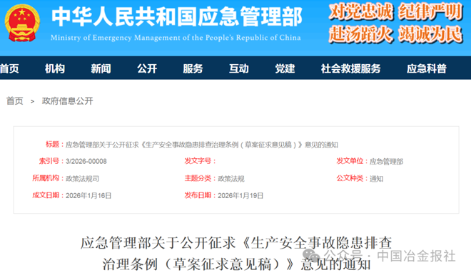 1月19日,应急管理部发布通知,就生产安全事故隐患排查治理条例征求意见。
