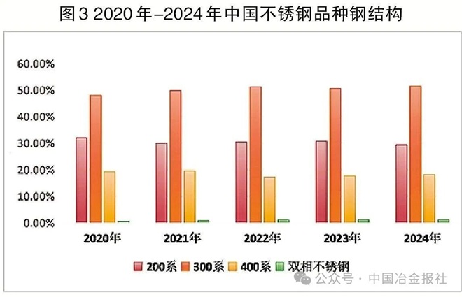 “十四五”期间,中国不锈钢品种结构调整明显加速。300系不锈钢比例从2020年的47.99%增至2024年的51.45%,200系不锈钢比例从32.11%下降至29.32%,双相不锈钢比例从0.62%增至1.04%。含钼不锈钢的产量从2020年的117.94万吨增加至2024年的220.44万吨,比例从3.8%增至5.59%,预计2025年含钼不锈钢产量将增至250万吨。