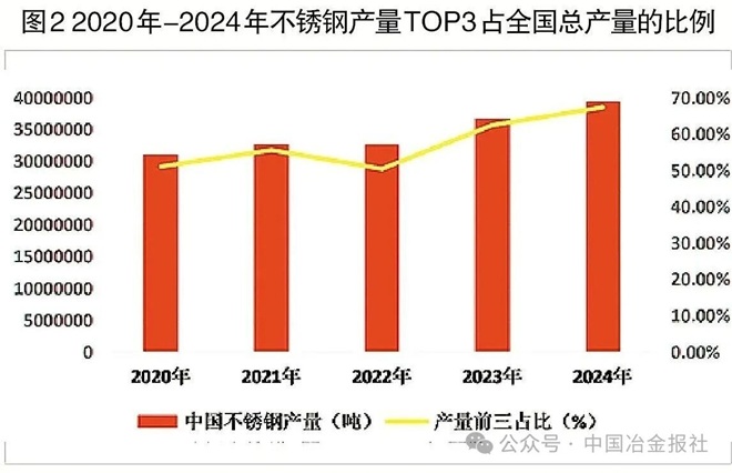 “十四五”期间,不锈钢行业产业集中度大幅提升。2025年底,中国不锈钢冶炼产能超过5000万吨,形成了以宝武太钢、青山集团等为代表的不锈钢产业集团。2020年—2024年,TOP3(不锈钢产量前三)不锈钢企业粗钢产量占比从2020年的50.94%提升至2024年的67.30%,行业集聚效应明显增强。
