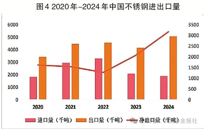 “十四五”期间,中国不锈钢行业实现了从单纯产品出口向“资源、产能、技术、标准”协同出海的深刻转变。在进出口方面,2022年中国不锈钢进出口量创历史新高,全年进口量达328.5万吨。随着“一带一路”市场开拓,中国不锈钢净出口量持续增长,2024年净出口量达316.6万吨,预计2025年净出口量将达350万吨。