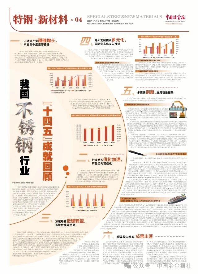 “十四五”期间,中国不锈钢行业在智能制造与高端装备、标准创新与品牌影响力、应用场景开拓创新等方面取得系列突破,行业竞争力显著提升。