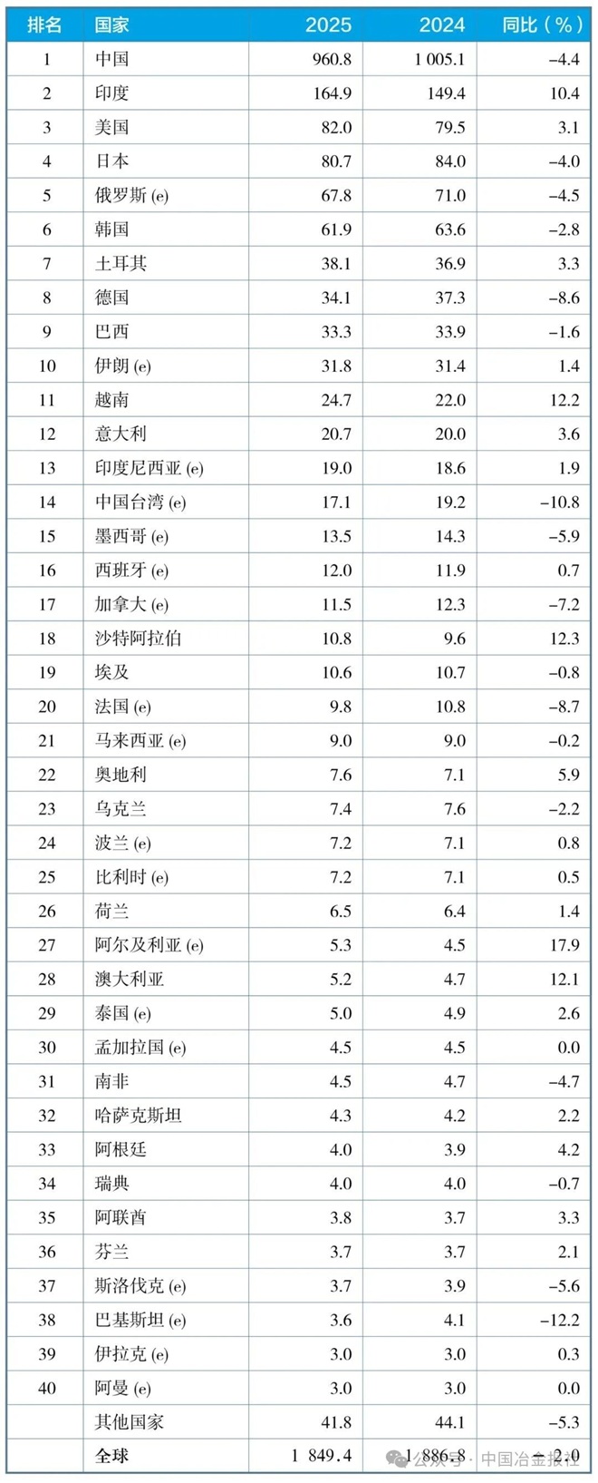 e - 预估值。排名依据为本年度累计粗钢产量。