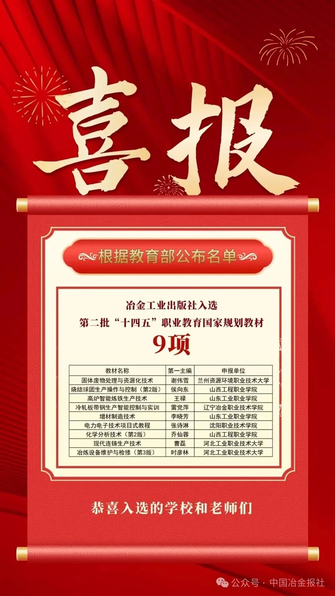 近日,教育部发布了《关于公布第二批“十四五”职业教育国家规划教材书目的公告》,冶金工业出版社9种教材成功入选,在此向入选教材的作者及院校表示祝贺。