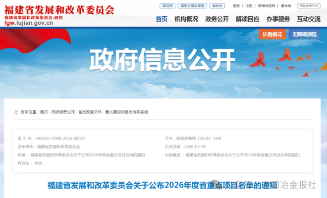 2月5日,福建省发展和改革委员会官网发布了关于2026年度福建省重点项目名单的通知。
