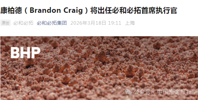 3月19日,必和必拓集团发布文章,宣布康柏德(Brandon Craig)先生为该集团新任首席执行官。康柏德先生将于2026年7月1日起正式出任必和必拓首席执行官兼执行董事,接替将于2026年6月30日卸任的现任首席执行官韩慕睿(Mike Henry)先生。