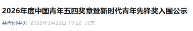 3月22日,公众号共青团中央发布《2026年度中国青年五四奖章暨新时代青年先锋奖入围公示》。