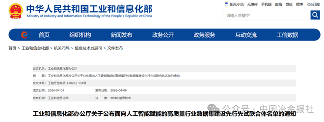 4月9日,工业和信息化部办公厅公布面向人工智能赋能的高质量行业数据集建设先行先试联合体名单,全国有14个单位上榜。其中,钢铁行业两个创新联合体入选。