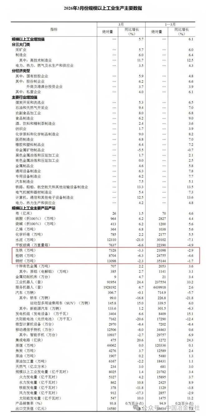 国家统计局数据显示:2026年3月份,中国粗钢产量8704万吨,同比下降6.3%;生铁产量7328万吨,同比下降3.3%;钢材产量13098万吨,同比下降2.3%。