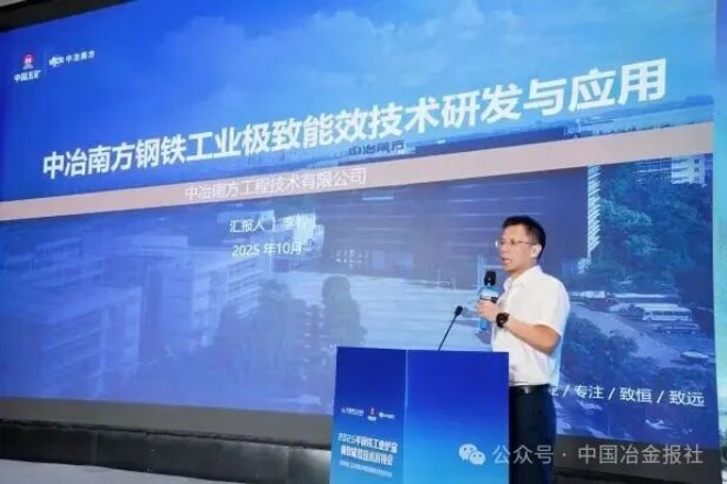 图为中冶南方工程技术有限公司李智作题为《中冶南方钢铁工业极致能效技术研发与应用》报告