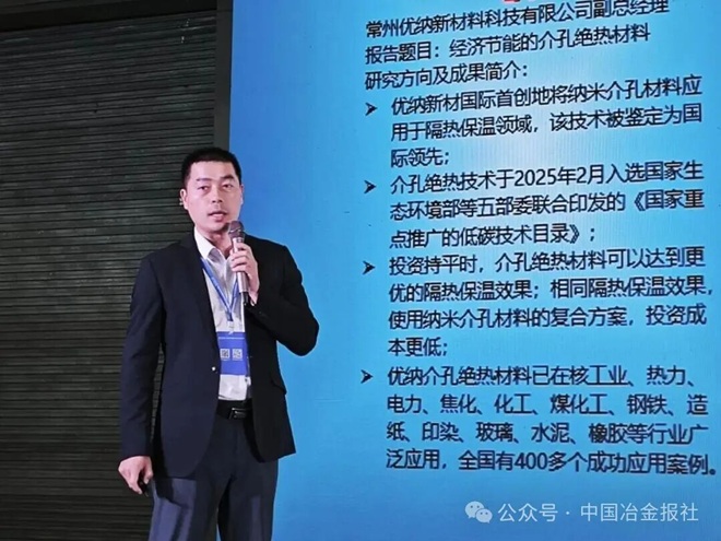 图为常州优纳新材料科技有限公司副总经理葛兵做《经济节能的介孔绝缘材料》报告