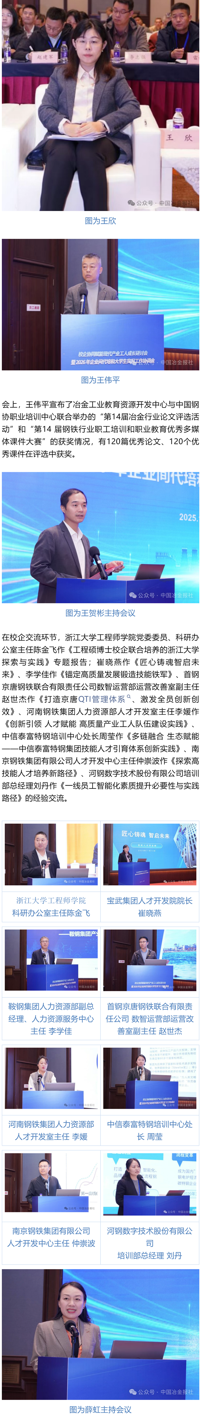 中国机械冶金建材工会工会副主席、分党组成员张杰,中国钢铁工业协会副秘书长赵金奎出席会议并讲话;中国机械冶金建材工会冶金工作部部长、一级调研员王欣,中国宝武人才开发院院长崔晓燕,鞍钢集团人力资源部副总经理、人力资源服务中心主任李学佳,包钢股份党委副书记王伟平,全国劳动模范、河钢集团工会兼职副主席郑久强,八钢集团工会副主席、党委宣传部、企业文化部部长妙旭嫣,济源钢铁集团纪委书记监事会主席兼人力资源部部长李全国,河钢集团人力资源高级经理赵震,靖江特殊钢有限公司党委组织部部长刘军,柳钢集团人才发展中心总经理区琴,首钢京唐人力资源部(党委组织部)副部长赵建军,长强钢铁人力资源部部长薛红以及来自40余家钢铁企业和东北大学、上海交大、浙江大学、北科大、西安建筑科技大学、河北工业职业技术大学、山东工业职业学院等11所高等院校的近百位人才培养专家参加会议。冶金工业教育资源开发中心主任王贺彬主持了上午的会议,薛虹主持了下午的会议。