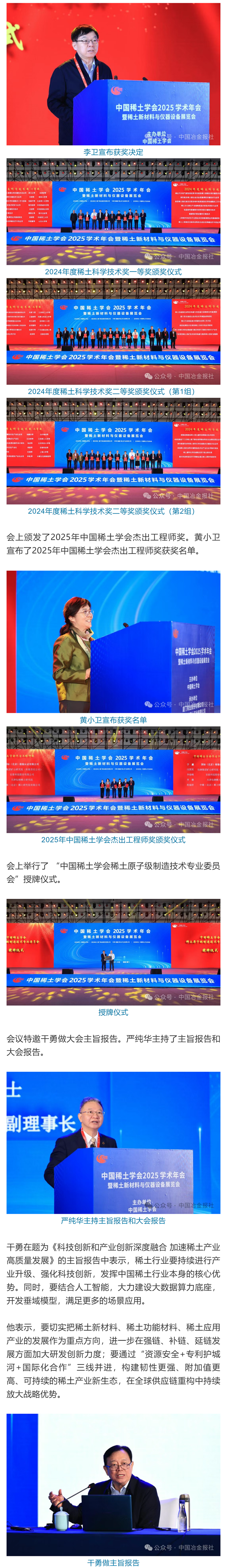 会上颁发了“2024年度稀土科学技术奖”。李卫宣布了《关于2024年度稀土科学技术奖获奖项目的决定》,此次获奖项目共有一等奖8项、二等奖24项。