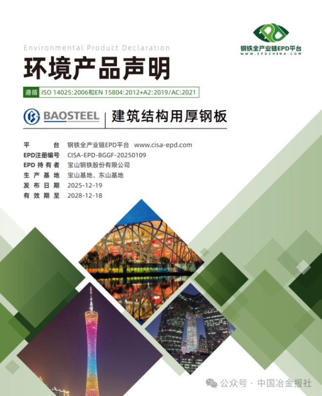 近日,中国宝武宝钢股份在钢铁全产业链EPD平台发布了建筑结构用厚钢板EPD(环境产品声明),成为该平台首份依据CEN(欧洲标准化委员会)EN15804:2012+A2:2019/AC:2029核心产品种类规则(PCR),并遵循平台已发布《PCR2025:02建筑用钢及钢结构产品(Ver2.0)》的EPD报告。此次依据EN15804发布的EPD,标志着宝钢建筑结构用厚钢板的环境绩效核算规则与全球主流实践趋于一致,为进一步拓展欧盟、北美等国际高端市场提供了“绿色护照”。此次发布的EPD覆盖宝钢股份宝山基地、湛江钢铁生产的建筑结构用厚钢板,产品厚度范围覆盖5毫米~200毫米。