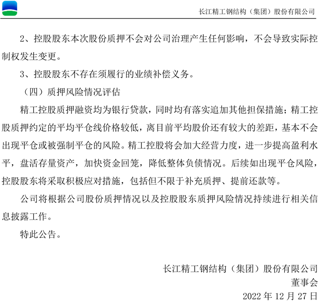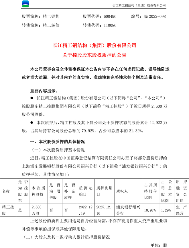 精工钢构:精工钢构关于控股股东股权质押的公告