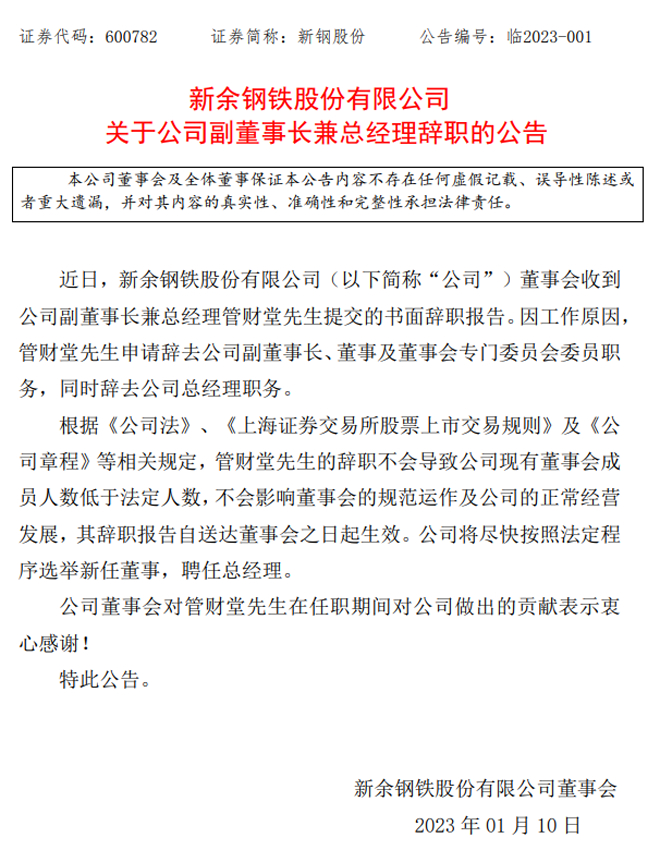 新钢股份:新钢股份关于公司副董事长兼总经理辞职的公告