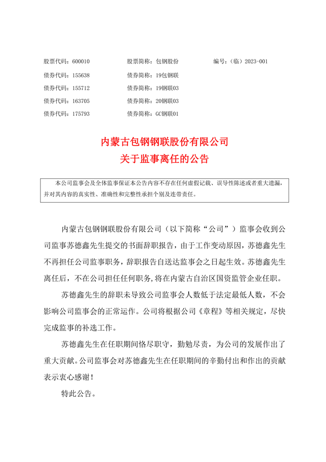 包钢股份:包钢股份关于监事离任的公告
