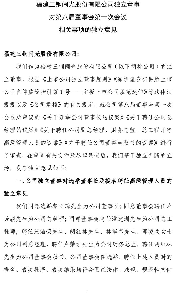 三钢闽光:独立董事对第八届董事会第一次会议相关事项的独立意见