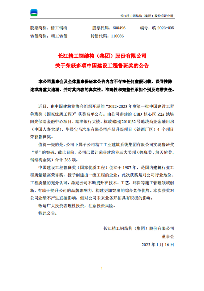 精工钢构:精工钢构关于荣获多项中国建设工程鲁班奖的公告