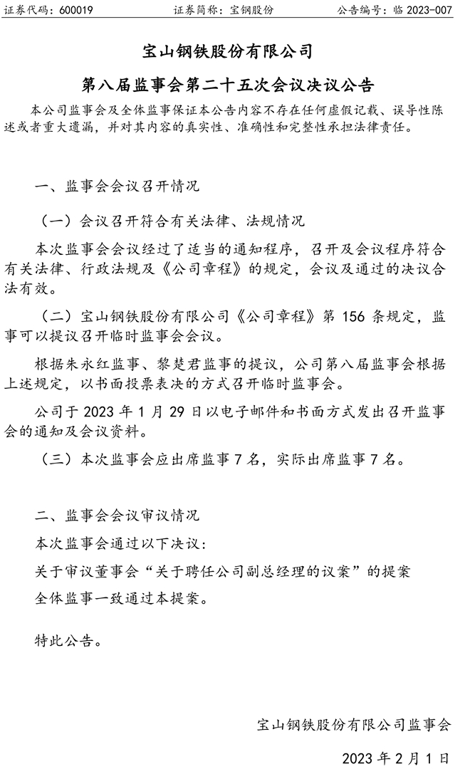宝钢股份:宝钢股份第八届监事会第二十五次会议决议公告