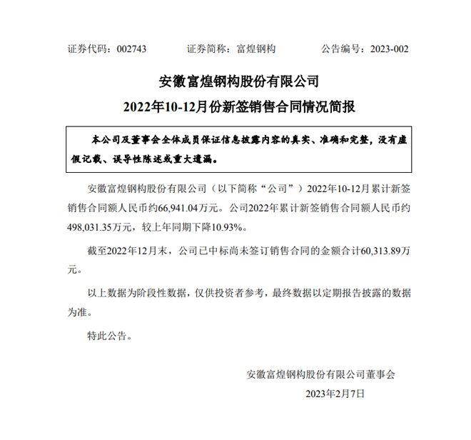 富煌钢构:2022年10-12月份新签销售合同情况简报