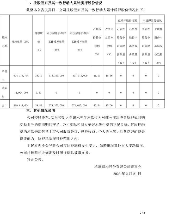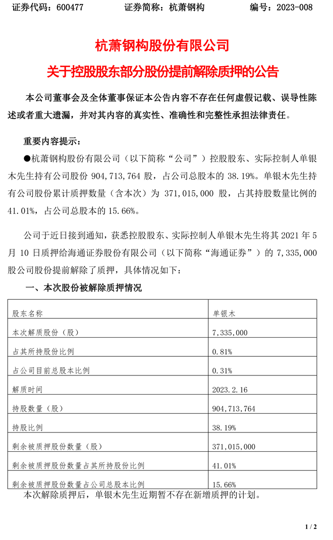 杭萧钢构:杭萧钢构关于控股股东部分股份提前解除质押的公告