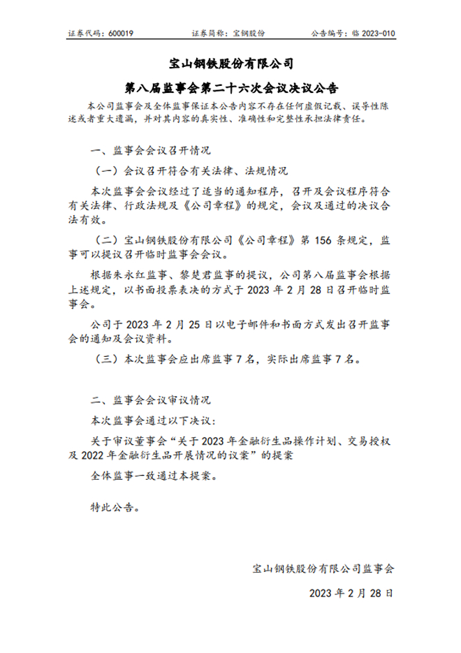 宝钢股份:宝钢股份第八届监事会第二十六次会议决议公告