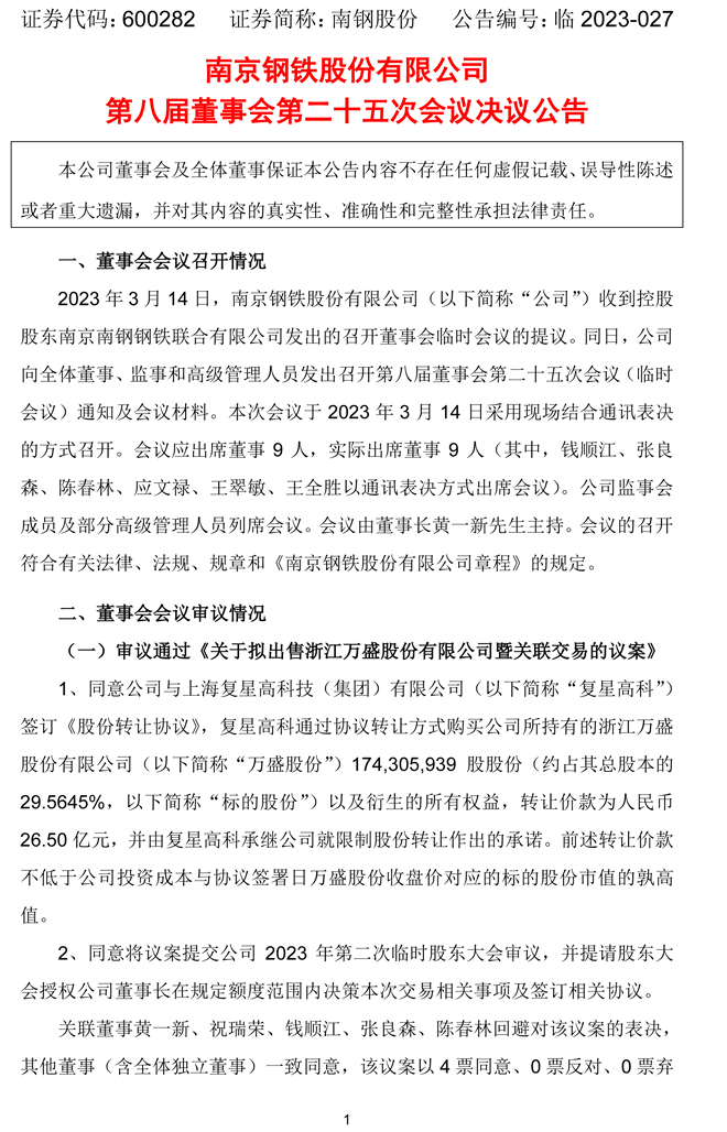 南钢股份:南京钢铁股份有限公司第八届董事会第二十五次会议决议公告