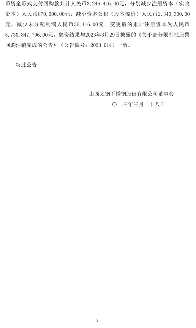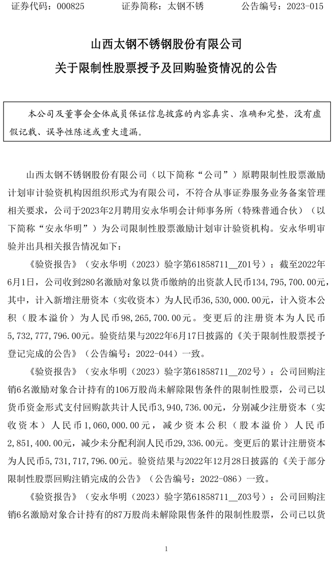 太钢不锈:关于限制性股票授予及回购验资情况的公告