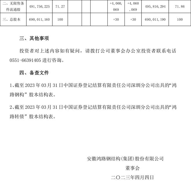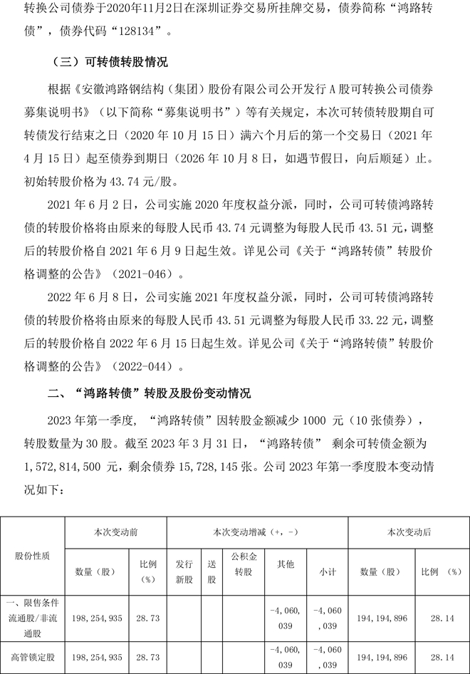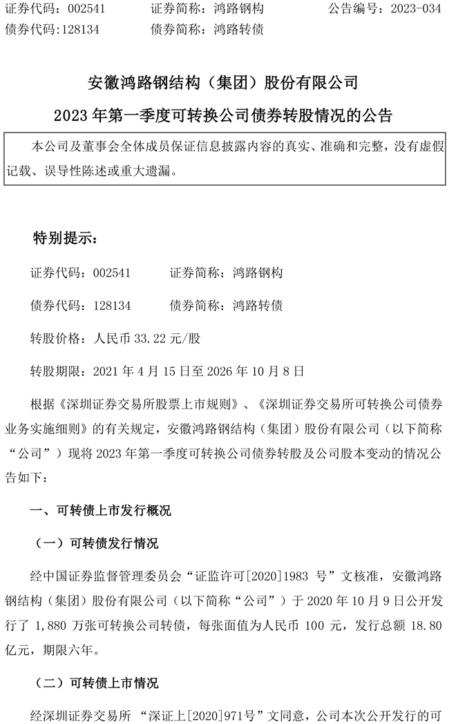 鸿路钢构:2023年第一季度可转换公司债券转股情况的公告