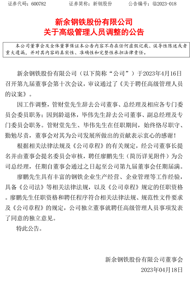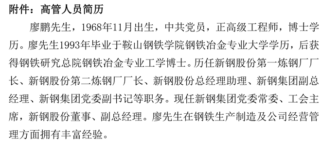 新钢股份:新钢股份关于高级管理人员调整的公告