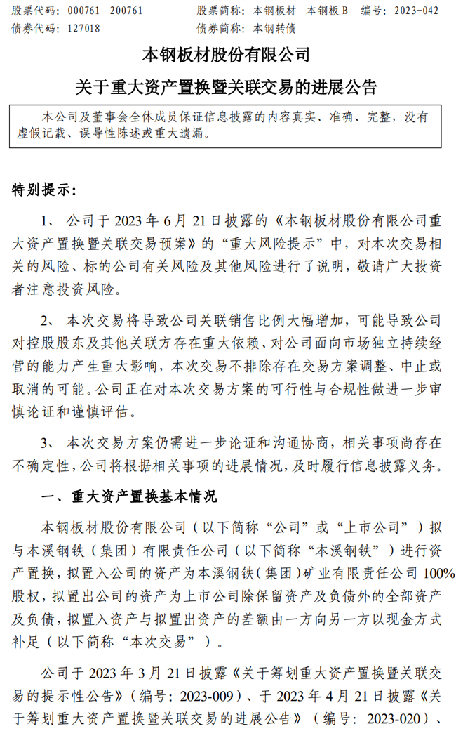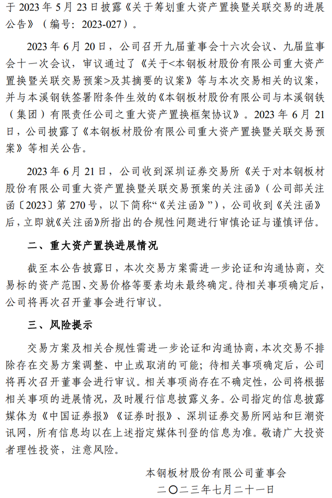 本钢板材:本钢板材股份有限公司关于重大资产置换暨关联交易的进展公告