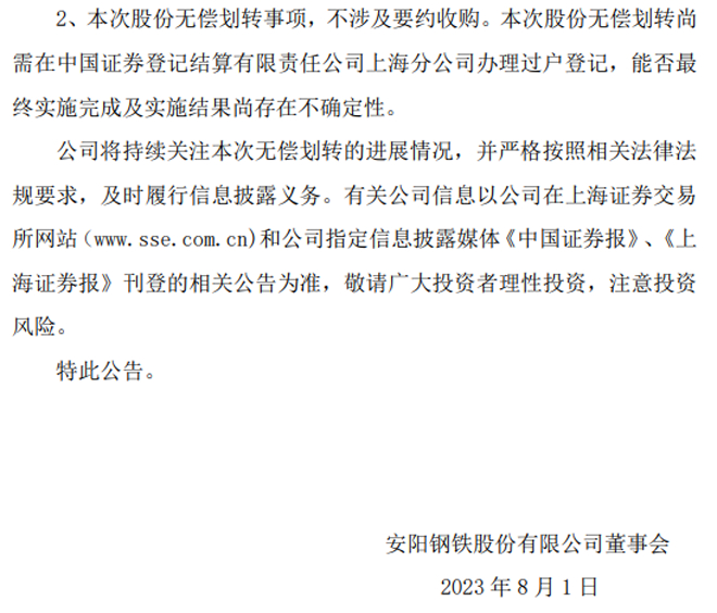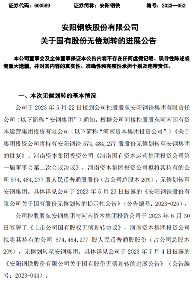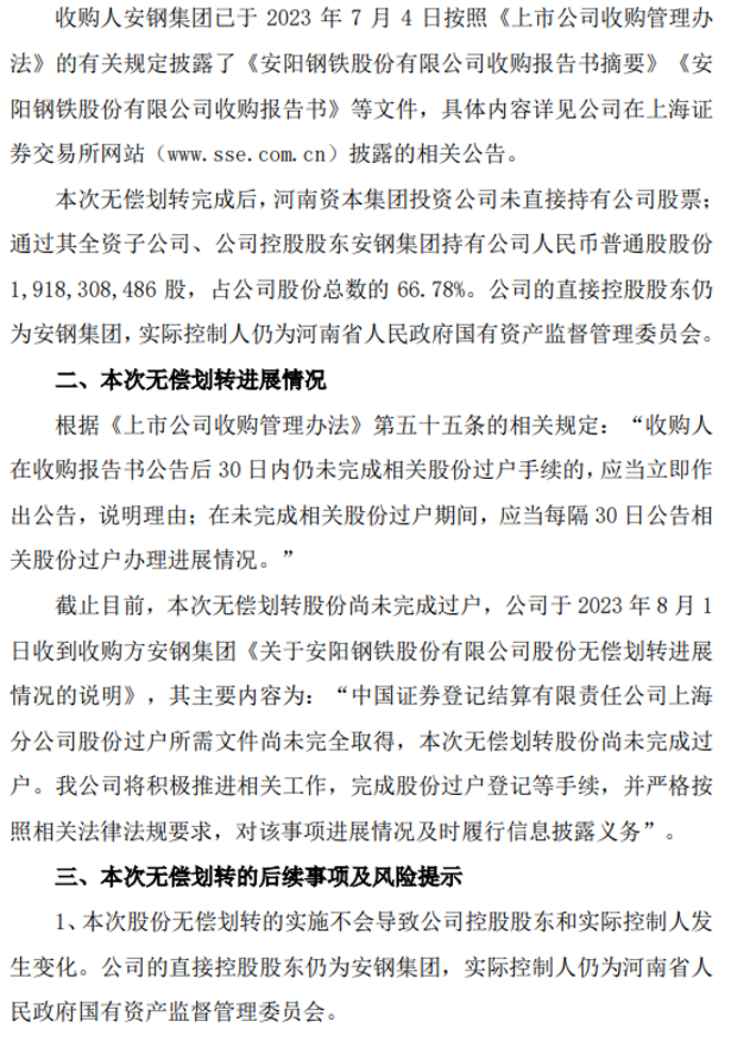 安阳钢铁:安阳钢铁股份有限公司关于国有股份无偿划转的进展公告