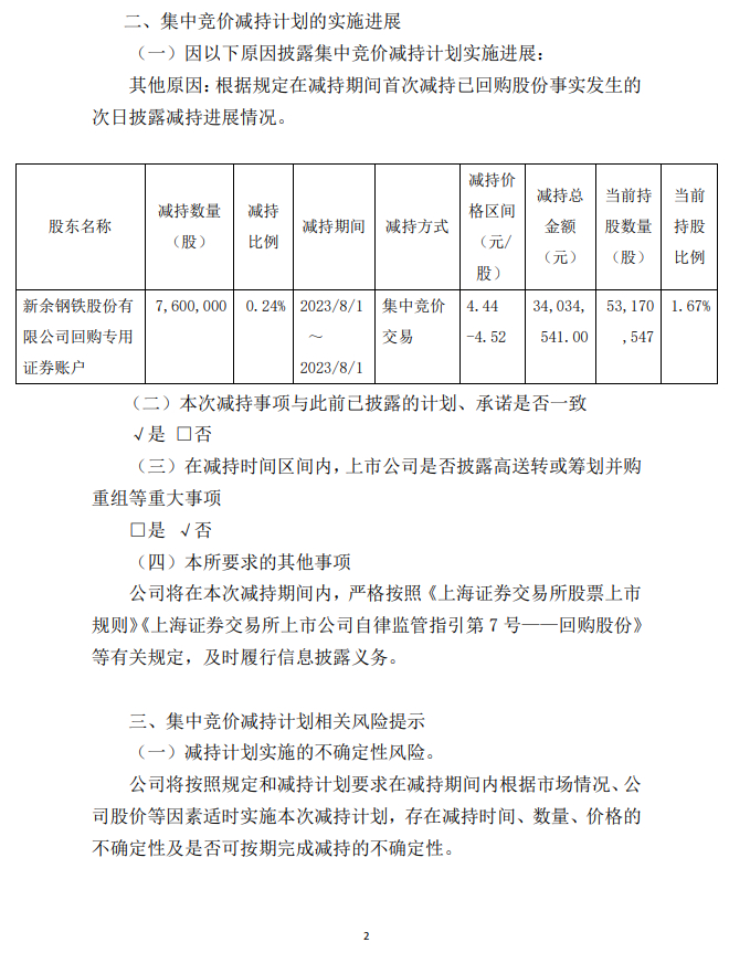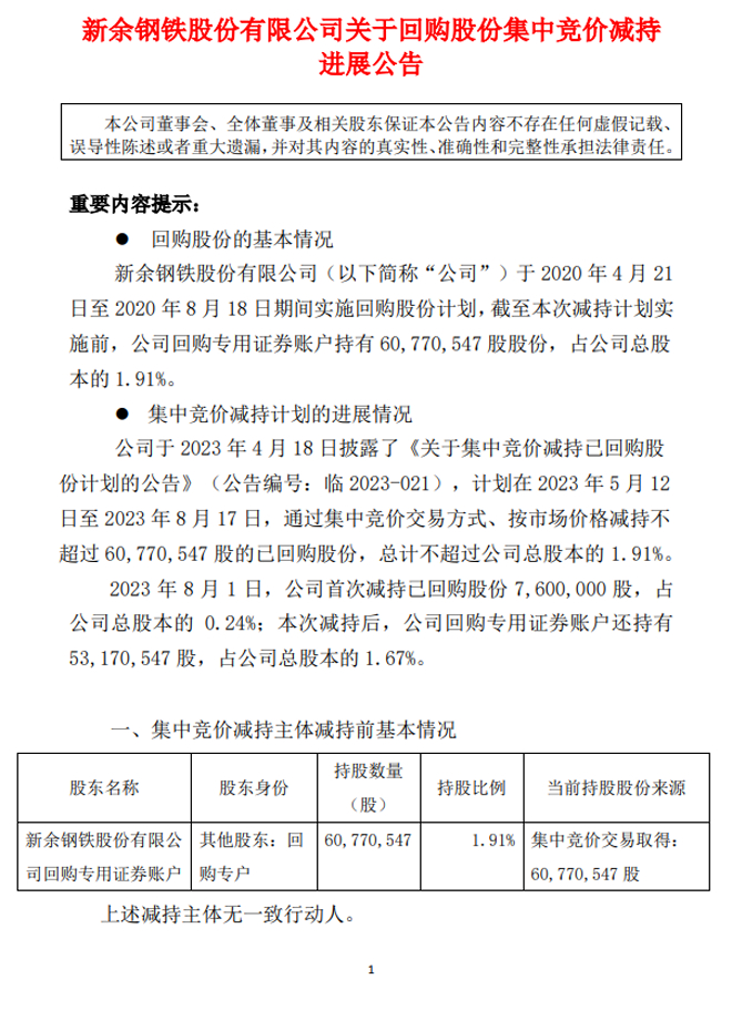 新钢股份:新余钢铁股份有限公司关于回购股份集中竞价减持进展公告