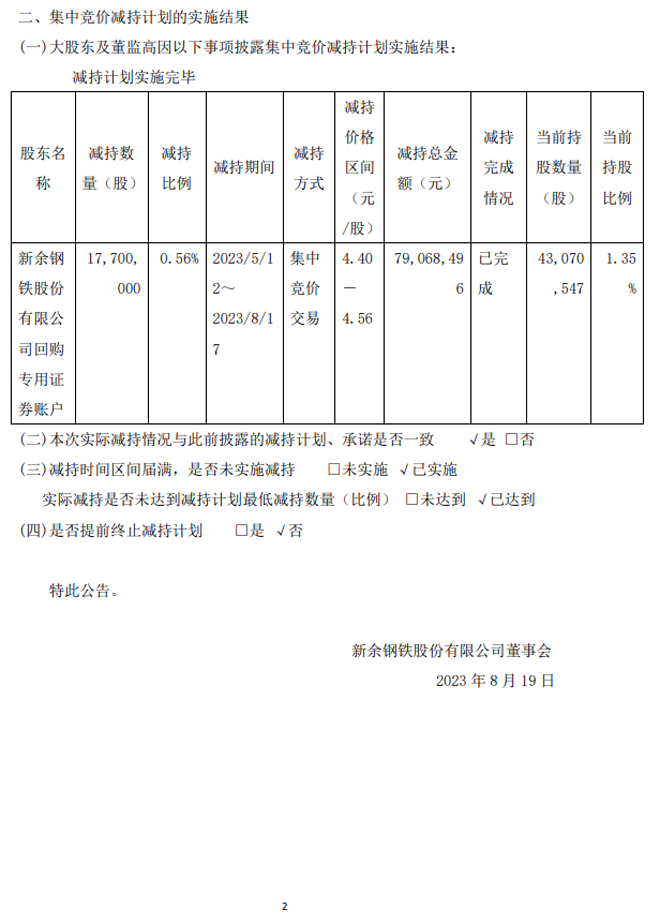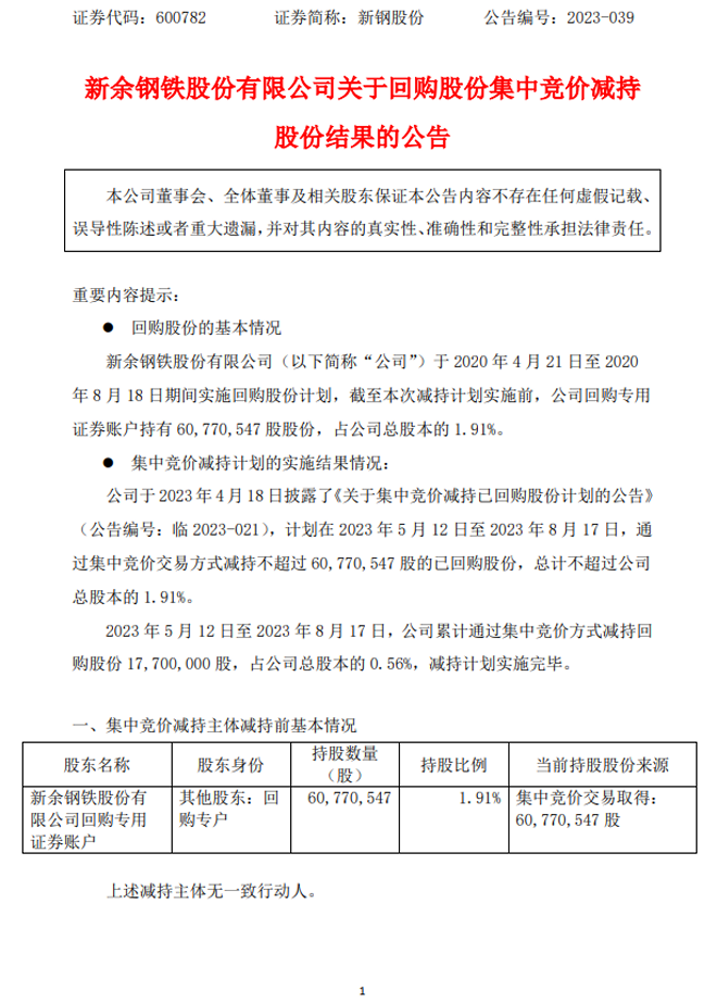 新钢股份:新余钢铁股份有限公司关于回购股份集中竞价减持股份结果的公告