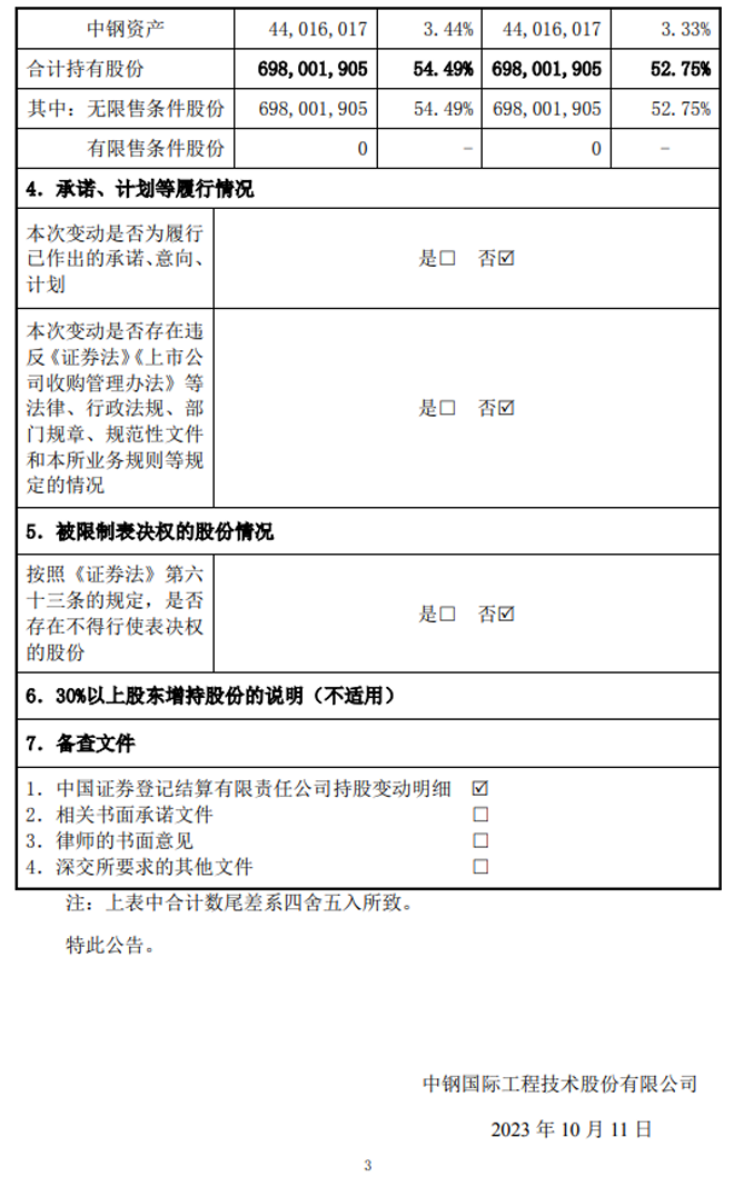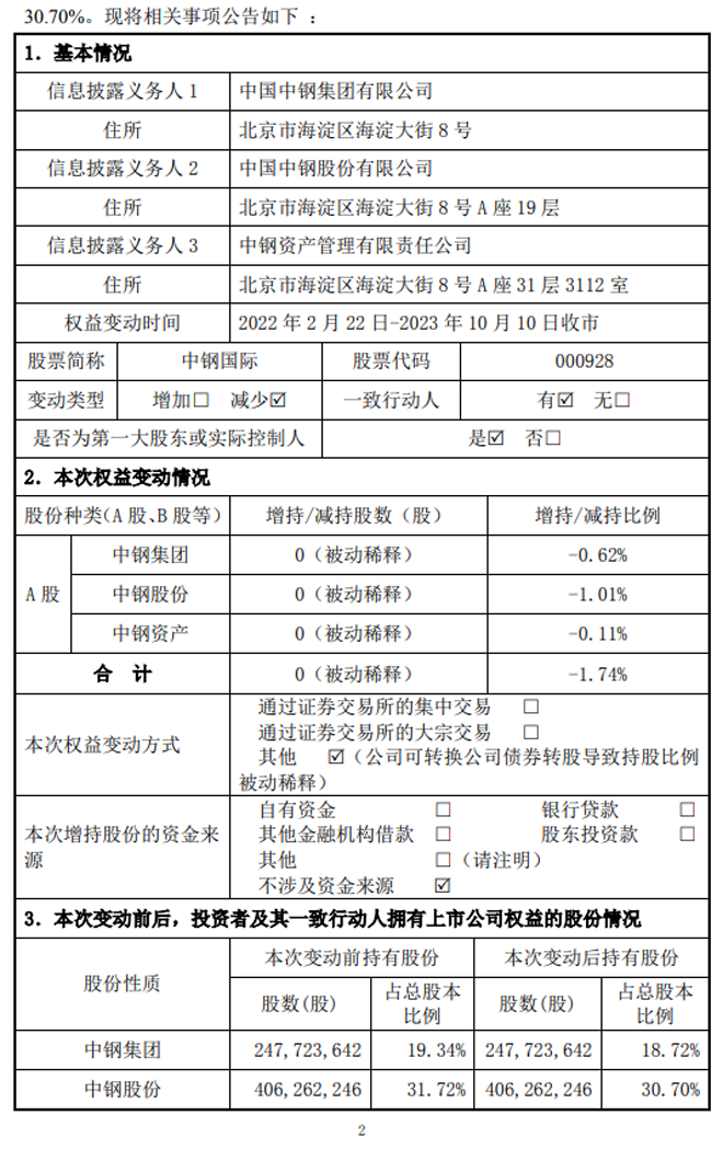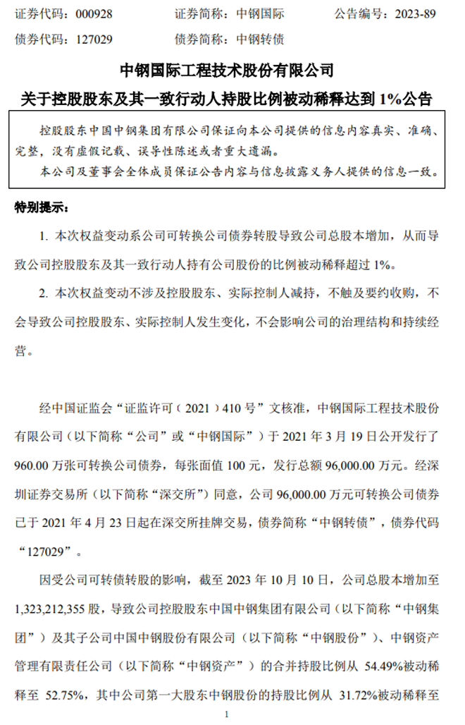 中钢国际:关于控股股东及其一致行动人持股比例被动稀释达到1%公告