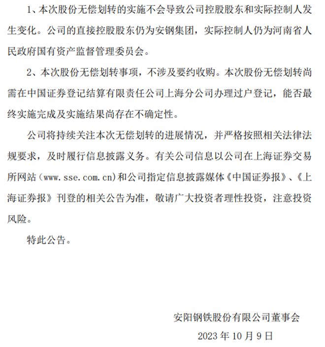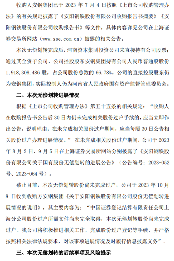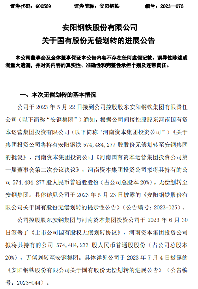 安阳钢铁:安阳钢铁股份有限公司关于国有股份无偿划转的进展公告