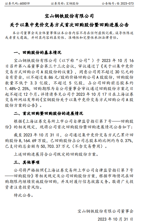 宝钢股份:宝钢股份关于以集中竞价交易方式首次回购股份暨回购进展公告