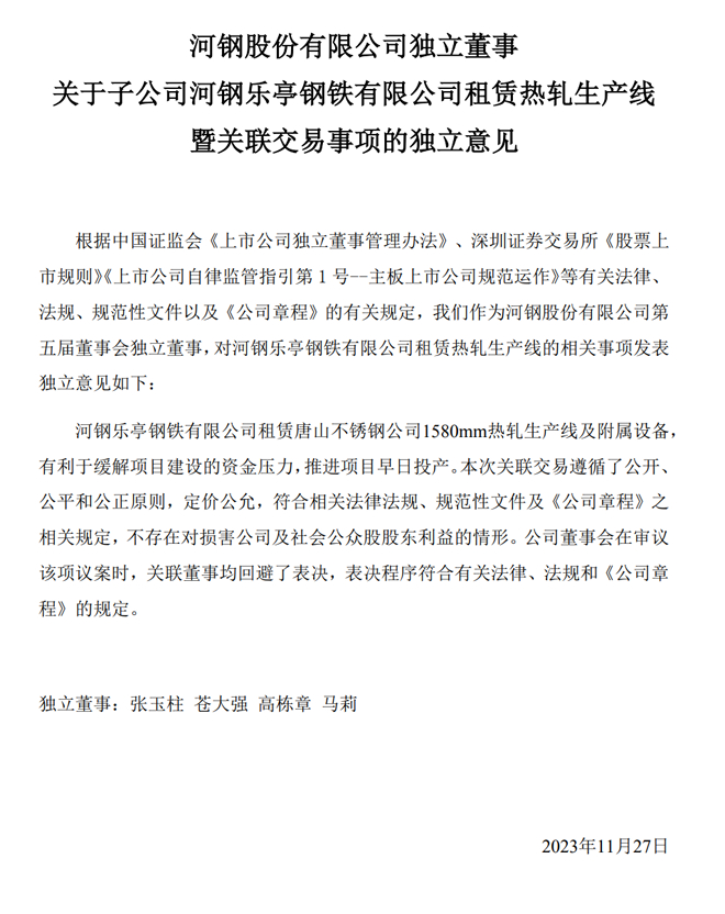 河钢股份:独立董事关于子公司河钢乐亭钢铁有限公司租赁热轧生产线暨关联交易事项的独立意见