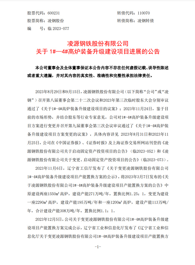 凌钢股份:凌源钢铁股份有限公司关于1#—4#高炉装备升级建设项目进展的公告